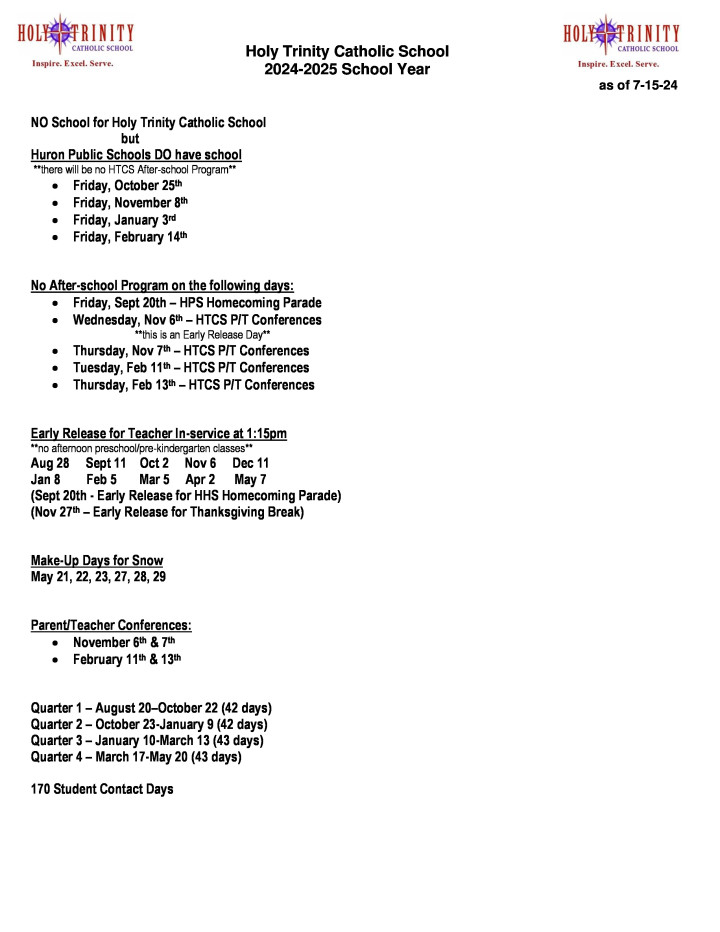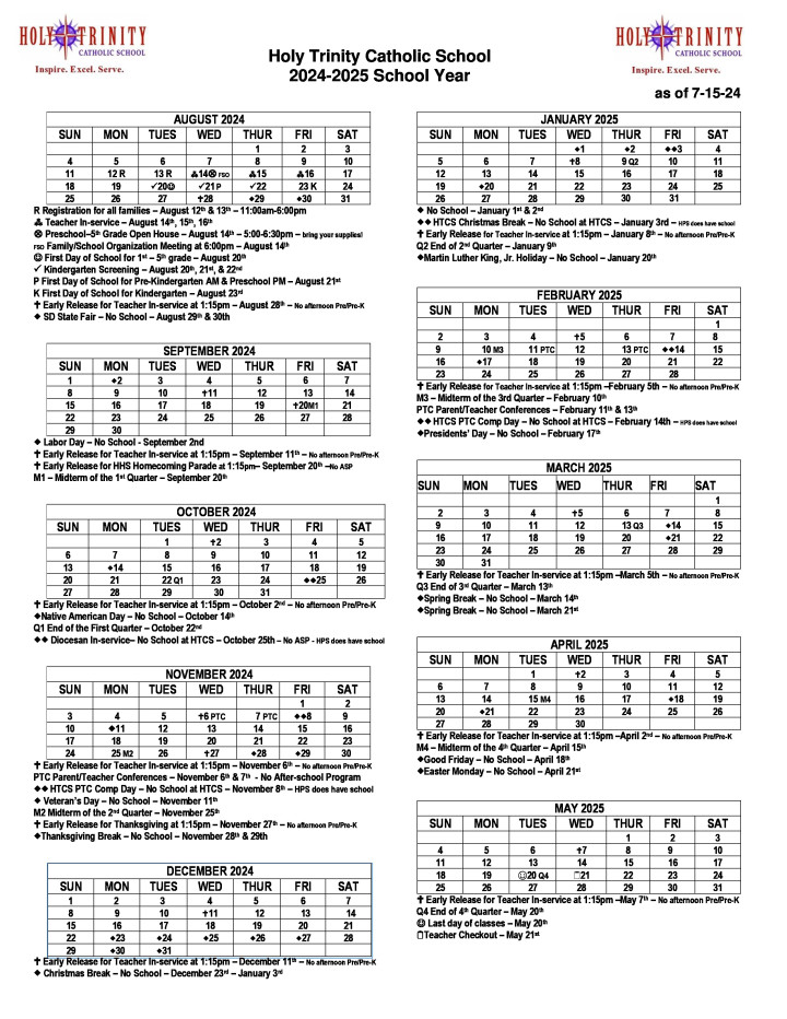 Holy Trinity Catholic School Students students in Grades K-5 will participate in a children’s mass on a weekly basis, Wednesday mornings at 8:30 a.m. The day of the week for mass may change if a Holy Day occurs on a different day during the week, or if school is closed on a Wednesday. Preschool and Prekindergarten students may attend mass at designated times. Uniforms are worn by Holy Trinity Catholic School students in Grades K-5 on Mass Days.